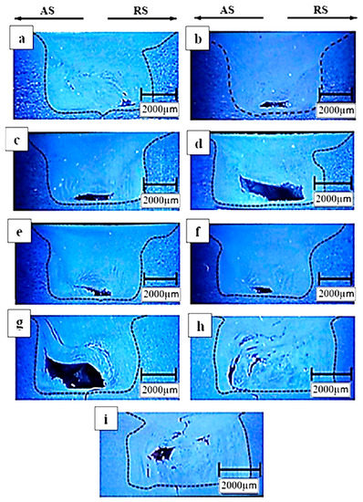Cross-section of the defective welds with rotational and traverse speeds of (a) 500 rpm, 41.5 mm/min; (b) 500 rpm, 80 mm/min; (c) 500 rpm, 125 mm/min; (d) 800 rpm, 41.5 mm/min; (e) 800 rpm, 80 mm/min; (f) 800 rpm, 125 mm/min; (g) 1600 rpm, 41.5 mm/ min; (h) 1600 rpm, 80 mm/min; (i) 1600 rpm, 125 mm/min [106]. Reprinted from: Study on the effects of friction stir welding process parameters on the microstructure and mechanical properties of 5086-H34 aluminum welded joints. The International Journal of Advanced Manufacturing Technology 83 (2016): 611–621, Mohammadzadeh Jamalian, H., M. Farahani, M. K. Besharati Givi, and M. Aghaei Vafaei, Copyright 2015, with permission from Springer Nature.