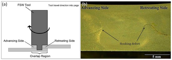 Apart from the defects observed in butt welds, friction stir lap welding (FSLW) also has special features at the edges of the bonded region, which is called a “hooking defect” [2]. In lap joints, one sheet is laid on top of another, and a slight overlap region is created. The FSW probe plunges completely through the upper sheet and slightly into the lower sample, traversing through the overlap region [124,125,126]. A schematic of the FSLW process is shown in Figure 9a. Shirazi et al. [127] observed such defects in their study on the FSLW of AA5456. Figure 9b shows an example of the hooking defect on both the advancing and the retreating sides of the joint conducted on 5 mm thick AA5456-H321 and 2.5 mm thick AA5456-O. According to their findings, the height and shape of the hooking were affected by rotational and traverse speeds [127]. Increasing the rotational speed enhanced the vertical material flow, leading to an increase in the hooking height. At a constant rotational speed, the height and direction of the hooking changed with the increase of the traverse speed. At low rotational speeds, the increase in the traverse speed resulted in decreasing the hooking height on both the advancing and retreating sides due to less vertical material flow [127]. Moreover, Salari et al. [128] suggested that a larger hooking defect had a more negative impact on the mechanical properties of FSLW AA5456. They also reported that an increase in rotational speed was a reason for increasing the hooking defect height [128].