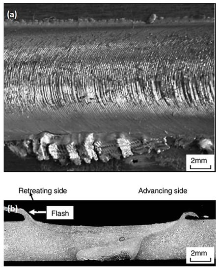 Lomolino et al. [61] reported that fatigue failures of FSWed joints of Al alloys were initiated at surface roughness or the surface flash of the joint. Figure 10 illustrates the typical surface defects in the FSWed joints. Based on their results, the fatigue failure of the joints was initiated from the notches introduced by pronounced lips or tool marks on the weld surface [61]. Accordingly, from the perspective of roughness, surface defects, and volumetric defects, the lower traverse speed and higher rotational speed provide the best fatigue performance due to the defect-free welds with smooth surfaces [46,96,129]. Nevertheless, there are also conflicting reports that the excess heat input, caused by the lower traverse speed and high rotational speed, may result in a large mass of flash on the surface [2,115,130].