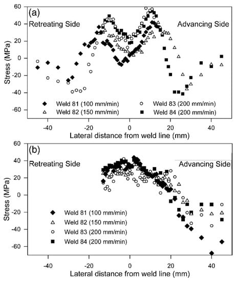 (a) Longitudinal and (b) transverse residual stresses as a function of welding speed lateral distance from the weld line for each weld [25]. Reprinted from: Microstructure, mechanical properties, and residual stresses as a function of welding speed in aluminum AA5083 friction stir welds. Acta materialia 51, no. 16 (2003): 4791–4801, Peel, M., A. Steuwer, M. Preuss, and P. J. Withers, Copyright 2003, with permission from Elsevier.