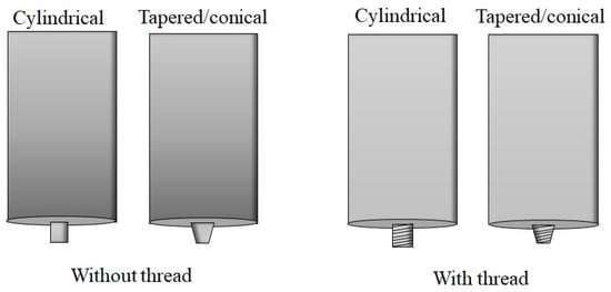 The tool geometry consists of a shoulder and a pin which have two primary functions: localized heating and material flow [1,134]. There are various tool pin shapes for the FSW process. As shown in Figure 12, the most common pin shapes for FSW of non-heat-treatable Al alloys are divided into two categories: cylindrical (with or without thread) and tapered/conical (with or without thread). In some cases, these types of tool pins are designed with flutes [47,48,135,136,137,138].