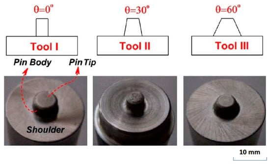 Schematic view and image of used tapered (center and right) and straight cylindrical (left) tools in this study [136]. Reprinted under the CC BY 4.0 License.