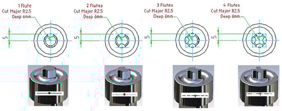 Examples of 1-flute, 2-flute, 3-flute, and 4-flute FSW tool design [150]. Reprinted from: Characterization of the influences of FSW tool geometry on welding forces and weld tensile strength using an instrumented tool. Journal of materials processing technology 203, no. 1–3 (2008): 46–57, Hattingh, D. G., C. Blignault, T. I. Van Niekerk, and M. N. James, Copyright 2008, with permission from Elsevier.
