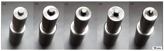 FSW tool pin profiles. (a) Cylindrical, (b) Hexagon, (c) Pentagon, (d) square, (e) Triangular [133]. Reprinted under the CC BY 4.0 License.