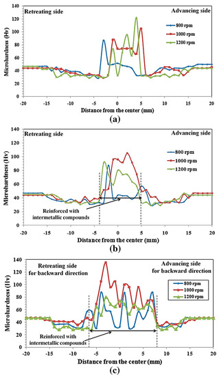 The incorporation of reinforcement nano- or microparticles in the microstructure of non-heat-treatable Al alloys can improve the mechanical strength of the stir zone, provided that an appropriate ratio of rotational and traverse speeds is chosen. In addition to the rotational and traverse speeds, the number of FSW passes and direction of the multi-passes are important variables that affect the FSWed joint quality in the presence of reinforcement particles [53,54,55]. The reinforcement particles can be ceramic-based particles, that are intrinsically hard, or intermetallic compounds formed in the microstructure by in situ reaction between metal powder and aluminum matrix. The homogeneous distribution of the reinforcement particles in the aluminum matrix is critical to have high strength FSWed joints [56,57].