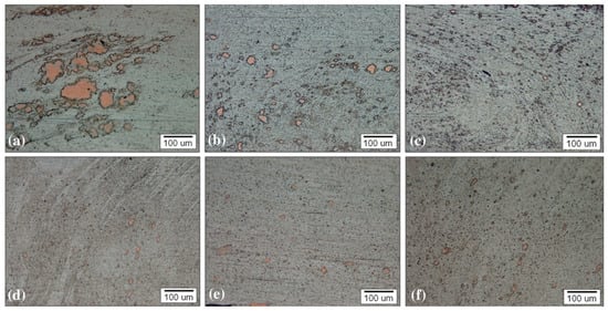 It should be noted that both insufficient and excessive heat input can lead to process defects in the joints [118]. According to the Han et al. study on the FSW of AA5083-O [95], when the rotational speed of the probe was too high, the peak temperature was stabilized. Therefore, more pressure on the probe shoulder became ineffective and led to a defect in the welded joint through chip formation. Based on their report, the optimum FSW conditions were a welding speed of 124 mm/min and a rotational speed of 800 r/min for AA5083-O [95]. In addition, Jamalian et al. [106] indicated that both low (500 and 800 rpm) and high (1600 rpm) rotational speeds at various traverse speeds (41.5, 80, and 125 mm/min) led to tunneling and wormhole defects in the FSWed joints of AA5086-H34. However, FSW at rotational speeds of 1000 and 1250 rpm showed a defect-free weld. Figure 7 shows the macrostructure of the defective joints obtained with different rotational speeds in their work. Figure 7a–f shows tunneling and wormhole defects at low rotational speeds, which were caused by insufficient heat generation and poor plasticity flow. At rotational speeds that were too high, these defects were generated as a result of considerable turbulence in the plasticized metal, as shown in Figure 7g–i [106]. Moreover, Javad Rasti [119] studied the welding parameters’ effect on the tunnel void area during a FSW of AA1060 at different rotational (500 and 1000 rpm) and traverse (250, 500, 650 mm/min) speeds. According to his findings, the area of tunnel cavity defect was zero for a rotational speed of 1000 rpm and traverse speed of 250 and 500 mm/min [119]. According to various works on FSW of non-heat-treatable Al alloys, it is concluded that the optimum rotational speeds are approximately 1000 rpm to achieve a defect-free joint, but the optimum traverse speed varies for different alloys. For example, in order to obtain a defect-free joint, 5xxx Al alloys generally need higher heat input caused by lower traverse speed compared to the 1xxx Al alloys [120]. This can be attributed to the mechanical properties and different flowing behavior of base metals. In high-strength Al alloys, such as AA5083 (275–385 MPa), it takes more time to reach the desired heat input and temperature for stirring materials. Therefore, the transverse speed should be slow. However, AA1060 requires lower heat input because of the lower tensile strength (55–130 MPa).