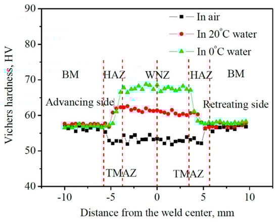 Furthermore, the heterogeneity of mechanical properties has been reported for different thickness layers (top, middle, and bottom) of FSWed joints [94,112,113,114]. For instance, Liu et al. [94] indicated that the hardness, ultimate strength, and yield strength of the middle layer were slightly smaller than the upper and lower layers of defect-free joints of AA1050-H24 sheet with a thickness of 5 mm. The lower heat output from the middle layer relative to the upper/lower layers, and the subsequent softening, was responsible for the weaker mechanical strength [94,112,113]. For thinner plates, the mechanical strength of the top, middle, and bottom is closer and more uniform [114]. However, for thicker plates, the heterogeneity of mechanical properties across the plate thickness is expected as the cooling rate and heat output vary from surface layers to central zones. In general, the increase in revolutionary pitch (low heat input) can help to minimize this heterogeneity in defect-free FSWed joints. Process cooling, such as water spray or underwater FSW, is another method for reducing the heterogeneity across the plate thickness, which is described in Section 5.