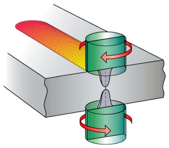 Friction stir welding (FSW) is a widely used solid-state joining process for metals and alloys developed at The Welding Institute (TWI) in 1991. The FSW process, for is used to integrate two metal pieces; the general principles are schematically shown in Figure 1. During the FSW process, a rotating tool is inserted into the interface between two workpieces, which is then traversed along the welding line. The rotating tool is usually composed of a pin and a shoulder. The applied plastic deformation and heat-induced by friction between the rotating tool and workpiece lead to the formation of a solid-state weld [1,2,3,4,5]. Although FSW is applicable for various metals [6,7,8,9,10], it is mostly used in the joining of Al alloys [1,11,12,13,14]. FSW of Al alloys has many advantages compared with conventional fusion welding processes (e.g., MIG and TIG). These include finer microstructure, better dimensional stability, lower processing defects, reduced residual stresses, and superior mechanical properties [3,15,16].
