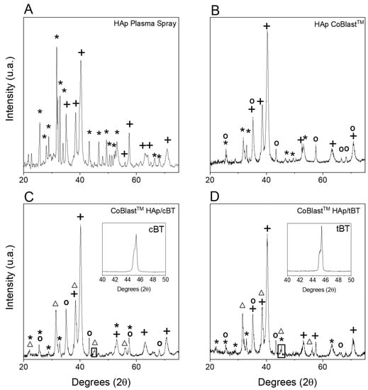 XRD analysis of the different coatings produced: HAp by plasma spray (A) and by CoBlastTM of HAp (B), 80%/20% HAp/BaTiO3 cubic nanopowders (C), 80%/20% of HAp/BaTiO3 tetragonal micropowders (D). +—Ti-6Al-4V; *—HAp; o—Al2O3; Δ—BT.