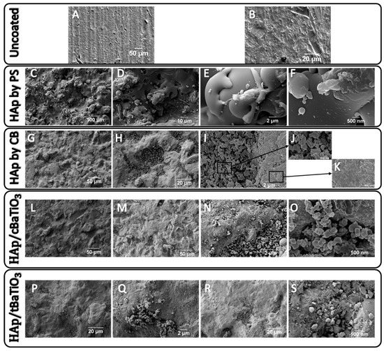 The SEM images in Figure 4 represent the surfaces of uncoated (A–B), Hydroxyapatite coatings produced by the HAp PS (C–F), HAp CB (G–K), HAp/cBaTiO3 (L–O) and HAp/tBaTiO3 (P–S), with several magnifications: 300×, 1000×, 5000× and 20,000×.