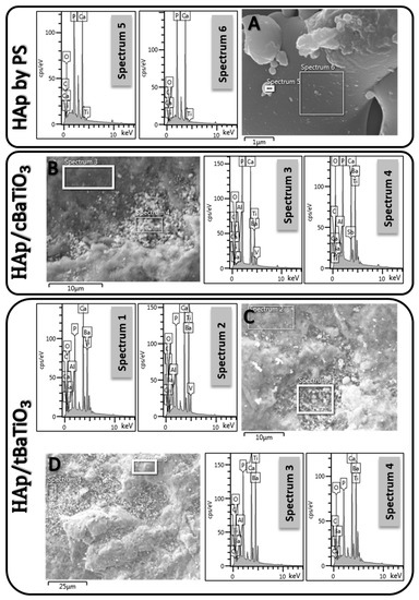 SEM/EDS images of HAp PS (A), 80%/20% (m/m) HAp/BaTiO3 using BT cubic nanopowders (B) and tetragonal micropowders (C,D). The marked areas correspond to the EDS spectra shown on the same line.