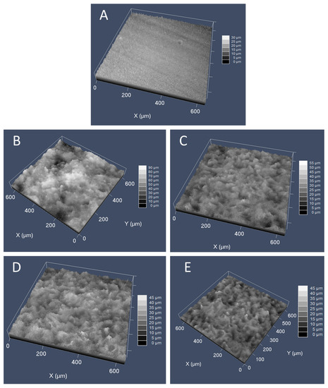 Confocal microscopy was employed to achieve a 3D reconstruction of the uncoated and coated surfaces and, hence, to study the roughness at a micrometric level. The different sample images are presented in Figure 6.