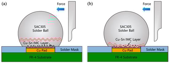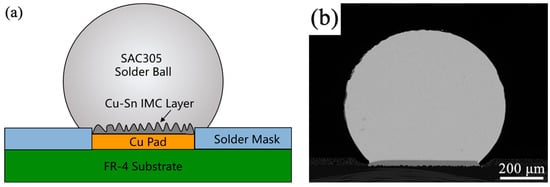 The experimental printed circuit board (PCB, made in China, manufacturer: Shenzhen Hqpcb Electronics Technology Co., Ltd., Shenzhen, China) substrate was made of glass fiber epoxy resin (FR-4), and SAC305 solder balls (made in China, manufacturer: Haipu Semiconductor (Luoyang) Co., Ltd, Luoyang, China) with a diameter of 760 μm were adopted. Cu pads with a diameter of 550 μm and a thickness of 35 μm were used as the pad materials. The pads were welded to the PCB board using surface mount technology (SMD). First, the pad surfaces were washed with anhydrous ethanol, applied with appropriate NC-559-ASM (made in American, manufacturer: Amtech Systems, Inc., Arizona, American) flux on the pad surface, and finally placed the SAC305 solder balls on the Cu pads. The reflow welding machine (model: T200N; made in Beijing, China; manufacturer: Beijing Torch SMT Incorporated Company, Beijing, China) was used to weld the SAC305 solder balls to the Cu pads. The peak reflow temperature was 245 °C and the holding time was 120 s. The schematic diagram and microstructure of the cross-section of a SAC305/Cu solder joint are shown in Figure 1. After the reflow soldering, a dark gray contrast intermetallic compound (IMC) layer was formed between the SAC305 solder ball and the Cu pad (Figure 1b).