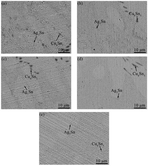 Figure 2 shows the internal microstructural evolution of the SAC305/Cu solder joints after long-term storage at −196 °C. The β-Sn matrix in the original internal microstructure mainly contained Ag3Sn precipitates with grey contrast and Cu6Sn5 precipitates with dark grey contrast (Figure 2a). Generally, the Ag3Sn or Cu6Sn5 precipitates mixed with the β-Sn matrix to form eutectics [25,26]. The Ag3Sn IMCs include long strip and granular forms, while Cu6Sn5 IMCs are massive. The Cu6Sn5 IMCs size is significantly larger than Ag3Sn, randomly distributed in the β-Sn matrix [27,28,29]. After storage at −196 °C for 240 h, the size of Ag3Sn becomes small and its quantity increases, which is distributed evenly and dispersedly in the β-Sn matrix. However, the size and distribution of Cu6Sn5 did not change significantly (Figure 2b).