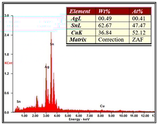 Figure 4 shows the microstructure morphology and interface element distribution of solder joints after reflow. The long-strip, granular Ag3Sn and massive Cu6Sn5 IMCs were distributed randomly and sparsely in the β-Sn matrix, as shown in Figure 4a. The IMCs at the interface of solder joints after reflow were mainly composed of short, rod-like Cu-Sn binary IMC. The mapping scanning results of EDS in Figure 4b–d revealed that the IMC was enriched in elements of Cu and Sn. Figure 5 shows the EDS analysis results of the short, rod-like compound at the solder/Cu pad interface (i.e., the red circle in the Figure 4a); the Sn and Cu are 47.47% and 52.12% (at. %), respectively. This result was consistent with the study of Hu et al. [33] and our previous studies [34,35], revealing the compound is Cu6Sn5 phase.