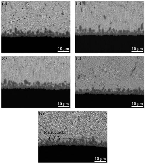 As shown in Figure 6, the SEM images reveal the interface microstructure of SAC305/Cu solder joints after storage at −196 °C at different times. The interface compound maintains the short rod shape, and the IMC thickness has not changed significantly with the extension of storage time (Figure 6b–d). In addition, it can be seen from Figure 6e that after being stored at −196 °C for 960 h, many microcracks appeared at the interface between the IMC and filler metal matrix. The thermal expansion coefficients of SAC305 filler metal and interface compound Cu6Sn5 are 25 × 10−6/°C and 16.3 × 10−6/°C, respectively [36], indicating that there are quite different. During storage at −196 °C, thermal expansion mismatch between materials causes thermal stress at the IMC of SAC305 filler metal/interface. Thus, the SAC305 solder is prone to creep at a higher temperature (approximate temperature > 0.3), but the approximate temperature at −196 °C is far lower than 0.3 (the melting point of SAC305 solder is 217 °C). Therefore, the solder joint cannot release the thermal mismatch stress at the interface through the creep of SAC305 solder during storage at −196 °C. Under the long-term effect of thermal stress, microcracks are formed at the SAC305 solder/interface IMC. The microstructure of shear fracture of solder joints stored at different temperatures with different storage times was analyzed, which only found cracks after long-term storage at −196 °C.