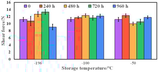 The shear force of SAC305/Cu solder joints after storage at different temperatures (−50 °C, −100 °C, −196 °C) with different times (240 h, 480 h, 720 h, 960 h).
