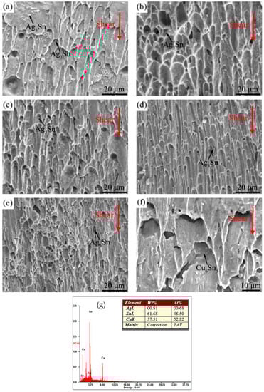 Figure 10 shows the microstructure of shear fracture of solder joints stored at different temperatures with different storage times. The direction of the shear force was labeled with the red arrows in Figure 10. As shown in Figure 10a, the solder joint fracture after reflow was composed of parabolic dimples. Only the Ag3Sn IMCs were observed at the bottom of the dimple, indicating that the fracture mode of the solder joints was a ductile fracture. Figure 10b shows the shear fracture morphology of SAC305/Cu solder joints stored at −50 °C for 960 h. Compared with the microstructure of the solder joint shear fracture after reflow, even if stored at −50 °C for 960 h, the dimple size and the Ag3Sn IMCs size of that did not change significantly. Combined with the research results of microstructures and shear properties of solder joints, it can be indicated that storage at −50 °C has no significant effect on the properties of SAC305/Cu solder joints. Figure 10c shows the shear fracture morphology of SAC305/Cu solder joints stored at −100 °C for 960 h, the fracture still presented a parabolic dimple shape. Its fracture mode was the ductile fracture inside the solder body. Compared with the shear fracture morphology of solder joints at −50 °C, the size of Ag3Sn at −100 °C decreases gradually and its distribution is more uniform and dispersed. The dispersed Ag3Sn particles in the solder play a role in dispersion strengthening; it is consistent with the increasing trend of the shear force of SAC305/Cu solder joints with the prolongation of storage time at −100 °C. Figure 10d shows the shear fracture morphology of SAC305/Cu solder joints stored at −196 °C for 720 h. The particle size of Ag3Sn IMCs was finer and more uniform. The fracture of the SAC305/Cu solder joint still consisted of the parabolic dimple. Figure 10e shows the shear fracture morphology of SAC305/Cu solder joints stored at −196 °C for 960 h. In addition to Ag3Sn IMCs, another type of particle was observed in the pits between the dimples. The EDS results showed that the particles were Cu6Sn5 IMCs, as shown in Figure 10g. Under the same experimental conditions, the same results were obtained for the shear fracture morphology of the samples. Therefore, the fracture morphologies of samples under the same experimental conditions are not listed here.