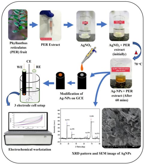 Phyllanthus reticulatus (PER) fruits were collected (from Kattankulathur, Chengalpattu district, Tamil Nadu, India), washed and stored at 4 °C in an airtight vial for further work. Silver nitrate (AgNO3) was procured from Sigma Aldrich, India. The all-other reagents were of analytical grade and used without further purification. Nicotine (C10H14N2) was procured from Sigma-Aldrich. The solutions used in the experimental procedure were freshly prepared using deionized (DI) water and kept away from the light to prevent any photochemical reactions.