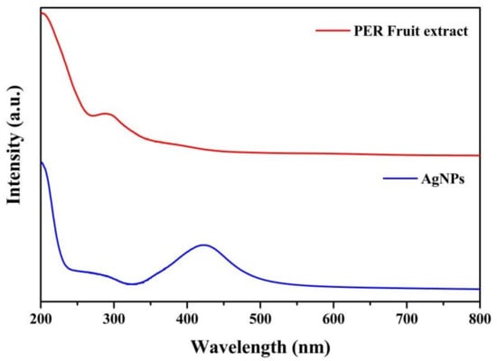 The UV-visible spectra served as an additional confirmation that nanoparticle formation in the water solution had occurred, according to Figure 5. The dispersion was examined in the range from 200–800 nm wavelength. This study revealed a surface plasmonic resonance (SPR) [41] at the 440 nm wavelength range, which correlated to the generation of Ag-NPs. Ag-NPs heavily absorbed light at a wavelength of ~422 nm due to the electron transition (blue curve). Also, PER fruit extract revealed an absorption peak at ~275 nm due to organic compounds present in the solution (red curve). The exact process of metal NPs extracellular synthesis is unknown. It was once believed that the nicotinamide adenine dinucleotide (reduced form: NADH) coenzyme served as an electron transporter to neutralize the Ag+ ions [42,43].