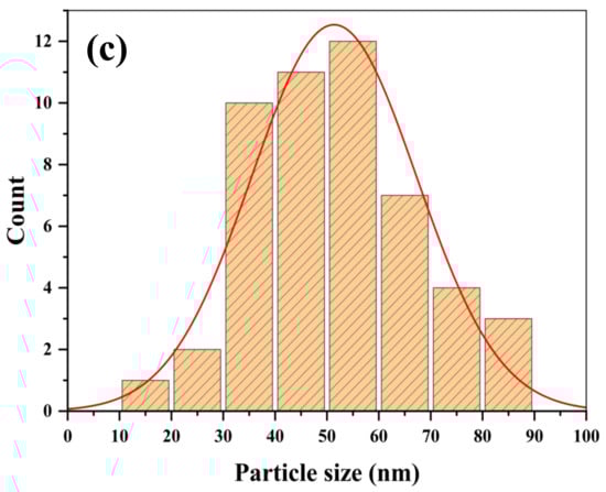 The Ag-NPs were analyzed by using FE-SEM to produce visual pictures. Figure 6a–c shows the morphology and size of the generated Ag-NPs. ImageJ software was used to measure the size distribution, which showed spherical nanoparticles between 10 to 90 nm (Figure 6c). These findings were consistent with the SPR peak’s form, which was seen by the UV-Vis spectrum at 422 nm. It was reported that the type of plant extract had an impact on the size and shape of the bio-synthesized nanoparticles [2]. Numerous studies have documented various forms of Ag-NPs, including triangular [31], spherical [26], pentagonal, cuboidal [44], and hexagonal [17]. As a result, the spherical Ag-NPs found in this work were consistent with the expected Ag-NPs forms, while other clustered configurations may be due to the presence of organic compounds in the extract. By transferring the electrons from the functional groups, the phytochemicals present in PER contributed to the reduction of Ag+ ions into Ag0 [36].