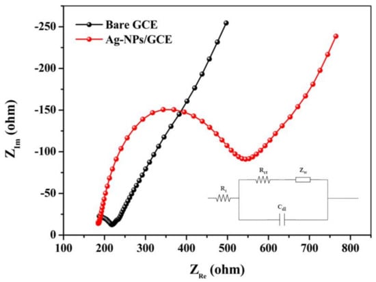 The Nyquist plots of bare GCE and Ag-NPs/GCE in a solution containing 5 mM [Fe(CN)6]−3/−4 in 0.1 M KCl with an equivalent circuit diagram (inset).