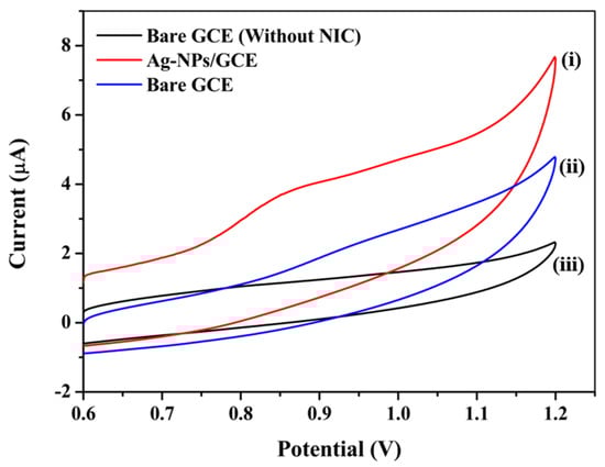 Cyclic voltammograms of Ag-NPs/GCE (i) and bare GCE (ii) were recorded in 0.1 M PBS containing 100 μM of NIC at a scan rate of 50 mV/s. CVs of bare GCE in the solution without NIC (iii).