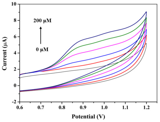 Cyclic voltammograms were recorded using Ag-NPs/GCE with different concentration of NIC (0 μM, 10 μM, 50 μM, 100 μM, 150 μM and 200 μM) in 0.1 M PBS at a scan rate of 50 mV/s.