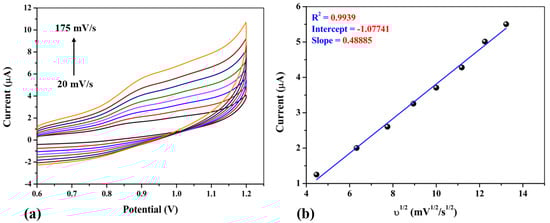 (a) CVs were recorded using Ag-NPs/GCE at different scan rates (20, 40, 60, 80, 100, 125, 150 and 175 mV/s) in 0.1 M PBS with 100 μM NIC. (b) The linear plot was made between the square root of scan rate and oxidation peak currents of NIC.