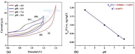 (a) CVs of Ag −NPs modified GCE were recorded in different pH solutions containing 150 μM of NIC (pH 4 (i), pH 6 (ii), pH 7.4 (iii), and pH 8 (iv)) at a scan rate of 50 mV/s. (b) The correlation between various pH and oxidation potential of NIC.