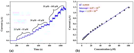 Since amperometry (I-T) could provide a low detection limit, great sensitivity, and excellent reproducibility, this technique was more frequently used to detect various analytes. The amperometric response of the Ag-NPs/GCE was recorded at an applied potential of 1.0 V in 0.1 M PBS (pH 7.4) containing various concentrations of NIC (Figure 12a). During this measurement, the buffer solution was stirred using a magnetic pellet at a speed of 750 rpm. To determine the standard deviation, amperograms were performed using a newly prepared Ag-NPs/GCE. Also, a calibration graph of NIC was made by plotting NIC concentrations against oxidation currents as shown in Figure 12b. With the addition of NIC concentrations, the oxidation peak currents were increased linearly. A linear relationship between the amperometric response and NIC concentrations was observed from 2.5 to 105 μM. The linear equation was found to be Y = 1.139 × 10-08x + 6.87 × 10-08, with a correlation coefficient (r2) of 0.9937. By using Equation (4), the limit of detection (LOD) was determined to be 0.135 µM.