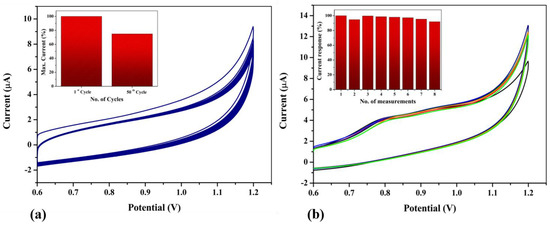 As shown in Figure 13a, the stability of freshly modified Ag-NPs/GCE was studied by recording continuous CVs in 0.1 M PBS for up to 50 potential cycles. It was noticed that background current was decreased only up to 25% at the potential of 1 V. Thus, the majority of the Ag-NPs are still attached to the surface of GCE. Although, some of the material was leached out of the GCE after multiple potential cycles which was commonly reported for various modified electrodes. From this study, it was believed that organic components covered Ag-NPs have firmly adhered to the GCE which can be used for NIC detection. Figure 13b shows the repeatability data for NIC detection on an Ag-NPs/GCE after eight independent measurements of 100 μM NIC in 0.1 M PBS. The bar diagram was also showed that the current response of the sensor for NIC detection was almost stable (inset of Figure 13b), which indicated the good repeatability of the sensor. Next, the selectivity of the newly prepared Ag-NPs/GCE was investigated by recording amperograms with the addition of various interfering molecules with 5 µM NIC, as depicted in Figure 14a. The oxidation responses of commonly encountered chemicals in saliva were also investigated, including acetic acid (AA), ascorbic acid (AsA, 2 µM), calcium chloride (CaCl2), glucose (Glu), magnesium chloride (MgCl2), urea, and uric acid (UA). These interference molecules were mixed with 0.1 M PBS (pH 7.4) and NIC in a 1:1 ratio. As shown in Figure 14b, the oxidation current response was decreased by about ~5% in the presence of these chemicals. This study further suggested that the tested chemicals had no significant impact during the measurement of NIC which may be credited to the organic compounds bound to the nanoparticles surface.