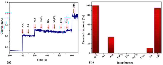 (a) Amperogram was recorded for interference compounds with (5 μM) NIC in 0.1 M PBS using an Ag-NPs/GCE under a rotation speed of 750 rpm, applied voltage of 1 V. (b) Bar plot shows the magnitude of current response changes after each addition of interference compounds.