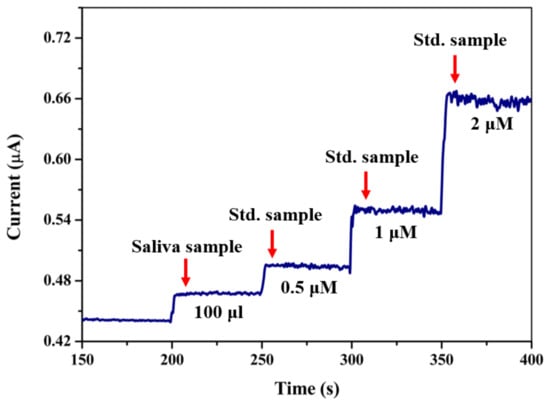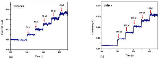 Figure 15a,b illustrates the amperometric detection of NIC content in tobacco and saliva samples using an Ag-NPs/GCE. These data demonstrated the practical application of the fabricated nanomaterial. For this analysis, salivary samples were collected from a person (age = 62) before and after the consumption of commercially available PAN masala. To conduct further experiments, both of the saliva samples were diluted using DI H2O, sonicated for five minutes, and then centrifuged at 5000 rpm for ten minutes. After the centrifugation, the supernatant was isolated. Various linear concentrations of both tobacco and saliva samples were added separately into PBS, and the resulting amperograms were recorded using an Ag-NPs/GCE. Figure 16 shows that our newly prepared sensor can be used to detect known concentrations of standard NIC solutions that were spiked. Table 3 shows the estimated concentrations of NIC in both the salivary samples and the spiked samples. The recovery values were also calculated which ranged from 98 to 102%. These results suggested that the Ag-NPs/GCE could be used to selectively detect NIC in real samples.