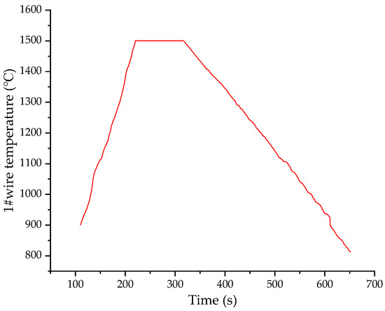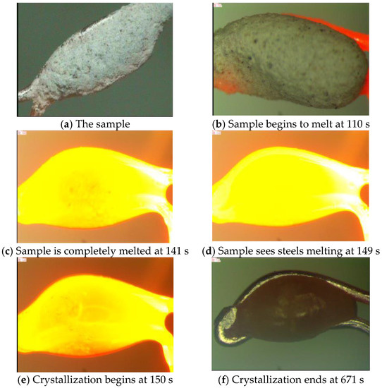 - Thirty grams of decarbonized mold flux are ground with a particle size of 200 mesh, and the 2–3 mg ground sample is placed on the contact point of the thermocouple; the temperature is continuously raised to 1500 °C. During this process, the mold flux gradually melts from solid to liquid.
