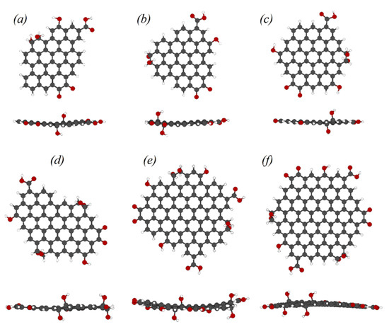 Atomistic models of oxidized graphene sheets: (a)—C47H18O7, (b)—C49H18O7, (c)—C55H18O8, (d)—C61H22O10, (e)—C84H26O13, (f)—C98H24O14.