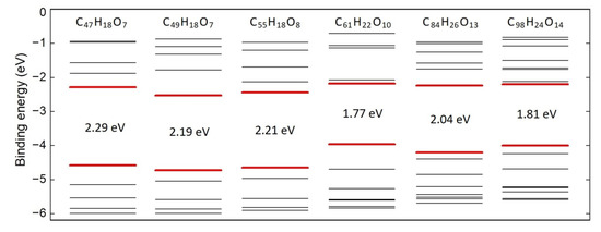 Oxidation leads to symmetry reduction and splitting of degenerate levels. The ground state Kohn–Sham (KS) energy levels diagram of the oxidized graphene sheets is shown in Figure 2. All structures demonstrate singlet ground state electronic configuration and an energy gap in the range from 1.77 eV to 2.29 eV. Analysis of charge density distribution for the chosen molecular orbitals has shown that the highest occupied molecular orbitals of the systems are formed predominantly by π-electrons in an aromatic core, while the lowest unoccupied MOs are localized at the K-regions with carbonyl groups and originate from p-electrons of carbon and oxygen (Figure S5 in the Supplementary Materials).