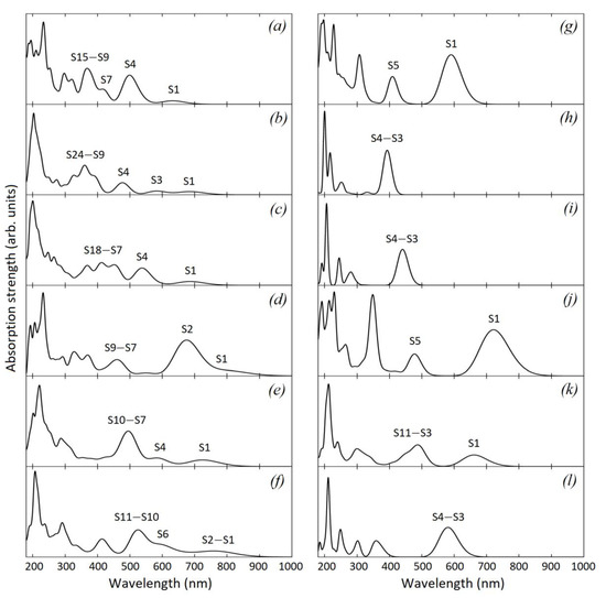 Typically, large polycyclic aromatic molecules reveal three characteristic optical bands α, p, and β with increasing intensity in the absorption edge [45,46]. The α-band with the highest wavelength is usually very weak and symmetry-forbidden in high symmetry groups. The p-band originates from HOMO → LUMO transition, it can be observed in the low-symmetry structures C46H18, C60H20, and C82H24 as the first intense absorption peak (the S1 peak in Figure 3g,j,k). The β-band has the lowest wavelength of the three and corresponds to a transition from HOMO to the second lowest unoccupied orbital (LUMO + 1) [47]. In the high-symmetry polyaromatic cores C48H18, C54H18, C96H24 p-bands are symmetry-forbidden, and very intense β-bands represent the absorption edge (S3–S4 bands in Figure 3h,i,l). These structures exhibit narrow absorption spectra with only few transitions.