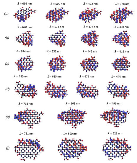 The most significant changes in absorption spectra were found for the structures C49H18O7 and C55H18O8 (Figure 3b,c). While the C48H18 structure exhibits absorption only in the ultraviolet region, the optical spectrum of the structure C49H18O7 covers the entire visible range. The C49H18O7 and C55H18O8 models have a similar absorption spectrum. In the long-wave range, according to Figure 3 and Table 1, the absorption spectrum of these systems is formed due to the transitions between two highest occupied and two lowest unoccupied molecular orbitals. In both structures the S1 absorption edge corresponds to the transition from the ground state to the first singlet excited state. It can be seen from the analysis of transition components that the S0 → S1 excitation is entirely determined by the HOMO → LUMO transition in these models. From Figure 4b,c one can see that the absorption edge is related to the optical activity of the carbonyl groups and neighboring carbon atoms, similar to the C47H18O7 model. In the C49H18O7 model, the S3 absorption band at 574 nm is also related to this photo-active region because it is formed mainly by the transition HOMO-1 → LUMO to the lowest unoccupied orbital. According to Figure 4b,c the S4 absorption band in the models C49H18O7 and C55H18O8 is largely due to the optical response of carboxylic and carbonyl functional groups. In the case of the C61H22O10 model the low-symmetry polyaromatic core produces an intense S2 absorption band associated with the low-energy π → π* transitions (HOMO → LUMO + 1). The spectrum also features the weak absorption edge at 785 nm due to the response of carbonyl groups as in the previous models (Figure 4d). The models C84H26O13 and C98H24O14 with the largest number of carbon atoms in the core demonstrate absorption spectra similar in structure despite differences in symmetry and C/O ratio. The long-wavelength absorption tail as in the previous models is formed by the HOMO → LUMO and HOMO → LUMO + 1 transitions (Figure 3e,f) and is related to the response of the electron-withdrawing oxygen functional groups and response of polyaromatic core (Figure 4e,f). The most intense absorption bands in these models are observed in the wavelength range of 500–600 nm. In the system C84H26O13 the absorption maximum in the visible region is at 496 nm and is related to the electronic transitions in the sp2-carbon network. In the C98H24O14 model, the absorption maximum is at 523 nm, and is due to the response of the zigzag edges as well as phenolic and carbonyl functional groups.