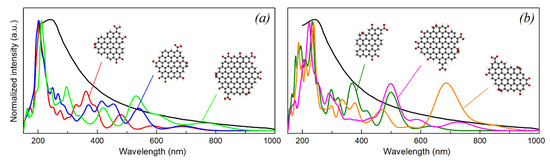 The electronic structure and absorption spectra of the polyaromatic cores were calculated for a better understanding of the role of oxygen functional groups. The electronic structure and optical properties of polyaromatic molecules largely depend on their symmetry. Structures C48H18, C54H18 and C96H24 with D3h and D6h symmetry respectively exhibit degenerate HOMO/HOMO-1 and LUMO/LUMO + 1 orbitals leading to wider energy gaps and transitions at shorter wavelengths (Figure S4 in the Supplementary Materials). The highest energy gap of 3.11 eV was observed for the C48H18 molecule with D3h symmetry (Table S3 in the Supplementary Materials).