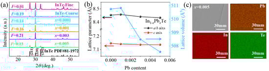 where I(hkl) and I0(hkl) are the peak integral intensities for the measured and randomly oriented samples, respectively [28]. In addition, the Pb-doped samples with large grain sizes also had the large orientation factor F(ll0), which was similar to that of the coarse pure polycrystalline InTe. This improved texture degree was highly beneficial to the utilization of the expected anisotropic transports of higher electrical conductivity and lower thermal conductivity along the [110] direction; this was confirmed by the investigation of the transports based on a single InTe crystal and could be taken advantage of to improve the TE performance of InTe [29]. Furthermore, the cell parameters were refined based on the XRD data, and the results are shown Figure 1b. It can be seen that the lattice gradually decreases with the increase in the Pb doping concentration, which is consistent with our experimental design with regard to the substitution of In+ by Pb2+ ions, because of their different ionic radii > > . In addition, the pure phases can also be confirmed by the uniform distribution of the elements, which can be seen from the EDS results presented in Figure 1c because there is no second phase that can be observed.