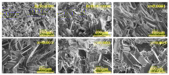 The SEM results are displayed in Figure 2, which clearly shows that the average grain sizes of the sieved coarse In1-xPbxTe (x = 0, 0.0001, 0.001, 0.003, 0.005) are larger than 150 µm, and this value is much larger than that of InTe-Fine (<50 µm). According to the previous studies, the large grain sizes are beneficial to the depression of the GBS of InTe and can be expected to considerably improve the carrier mobility below 500 K [15,30,31]. Therefore, the samples with large grains can remove the influence of the grain size when analyzing the relation of the carrier concentration and the GBS in this work.