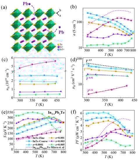 (a) Diagram of the Pb doping at In+ site in InTe with the covalent chained crystal structure. Temperature dependence of the electrical properties of the sieved fine InTe and coarse In1-xPbxTe (x = 0, 0.0001, 0.001, 0.003, 0.005). (b) Electrical conductivity, (c) Hall carrier concentration, (d) Hall carrier mobility, (e) Seebeck coefficient, and (f) power factor [21].