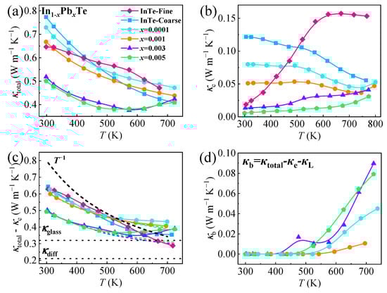 Temperature dependence of the thermal properties of the sieved coarse In1-xPbxTe (x = 0, 0.0001, 0.001, 0.003, 0.005) and the sieved fine InTe. (a) Total thermal conductivity, (b) electron thermal conductivity, (c) lattice thermal conductivity. The solid part is calculated by κotal-κe, and the dashed part is obtained by fitting the solid part within 300–400 K according to aT−1 + b, which is then extrapolated in the subsequent temperature range. The dotted lines are the minimum thermal conductivity calculated by Chaill model and diffusion model [45,46]. (d) Bipolar thermal conductivity.
