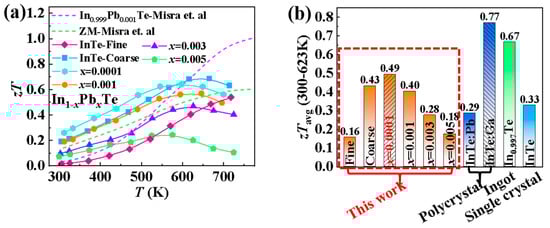 (a) Temperature dependence of zT, (b) the average zT within 300–623 K for our In1-xPbxTe (x = 0, 0.0001, 0.001, 0.003, 0.005) samples in comparison with the values in other literature [15,16,21,29].