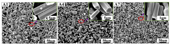 As shown above, samples A1, A4 and A7 showed perfect hexagonal prism morphology and were prepared in hydrochloric acid solution. Samples A2, A5 and A8 prepared in nitric acid solution have a large number of hexagonal prism structures and a small number of one-dimensional linear structures, but sample A8 showed hexagonal prism morphology and a large number of small cavities on the surface. Samples A3, A6 and A9 prepared in sulfuric acid solution had fibrous structures, which followed a certain direction. In Figure 2, the edge of h-MoO3 gradually disappears as the concentration of AHM, the reaction temperature and the reaction time increase. The length of the hexagonal prisms is about 20 µm, and the length of the hexagonal sides is about 2 µm in samples A1, A4 and A7. The hexagonal prisms of h-MoO3 became rounded and smooth in sample A7. With the decrease in reaction temperature, the increase in AHM concentration and the prolongation of reaction time, it can be found that the hexagonal prism morphology of h-MoO3 becomes more obvious in Figure 4. Sample A8 with complete hexagonal prism morphology shows that the length of the hexagonal prisms is about 20 µm, and the side length of the hexagonal is about 2 µm.