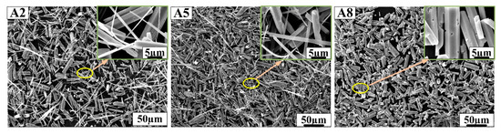 SEM morphology of samples A2, A5 and A8 prepared in nitric acid solution.
