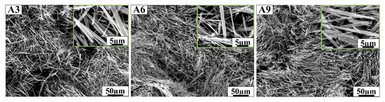 SEM morphology of samples A3, A6 and A9 prepared in sulfuric acid solution.