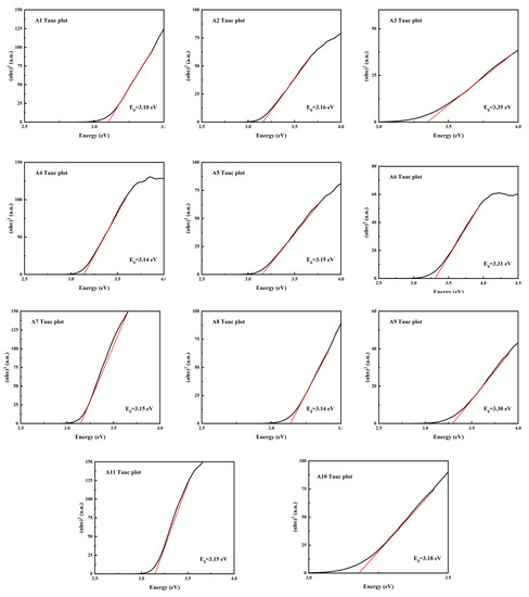 As shown in Figure 7, the reflectance drops sharply when the wavelength is about 420 nm in diffuse reflection, indicating that the sample absorbs the energy of light in this wavelength range. The phenomenon of blue shift of absorption peaks in samples A3, A6 and A9 indicates that these samples have a larger band gap and require more energy illumination to make the electron transition. The band gap width of the sample can be obtained through the Tauc plot method, which is mainly based on the formula proposed by Tauc, Davis and Mott et al. This is Equation (5) [28]. The Kubelka–Munk function is Equation (6) [29].