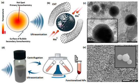 (a) The schematic representation of acoustic bubble and its corresponding hot-spot and surface regions where the primary and secondary sonochemistry reactions occur. (b) The graphical scheme of engulfed galinstan NP in CNT network and (c) its corresponding TEM image. (d) The sequential ultrasonication and centrifugation process for CNT removal. (e) The SEM image of functionalized galinstan NPs.